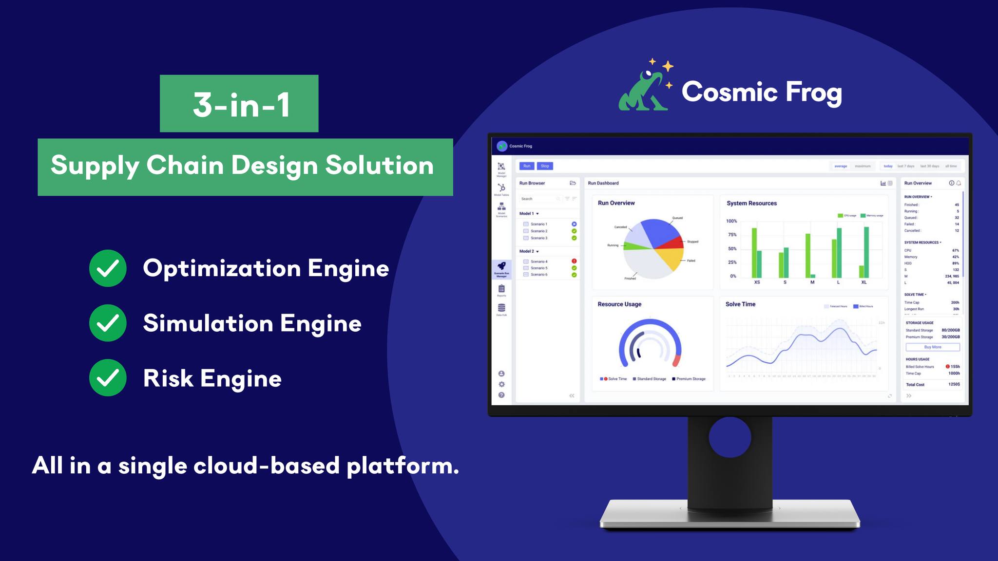 One hundred percent SaaS-based, the Cosmic Frog solution helps organizations move away from chaotic spreadsheets and making decisions off “gut feel” to using real data to drive results. Optilogic is the only design solution that provides a risk rating on every scenario, so customers can make more information decisions beyond just cost. Cosmic Frog network optimization runs 40% faster than competitor solutions, is accessible from anywhere, and uses hyperscaling technology to allow hundreds of models and scenarios to run in parallel on enterprise-scale computing resources. Cosmic Frog was named Risk Management Innovation of the Year by SupplyTech Breakthrough Awards in 2024.